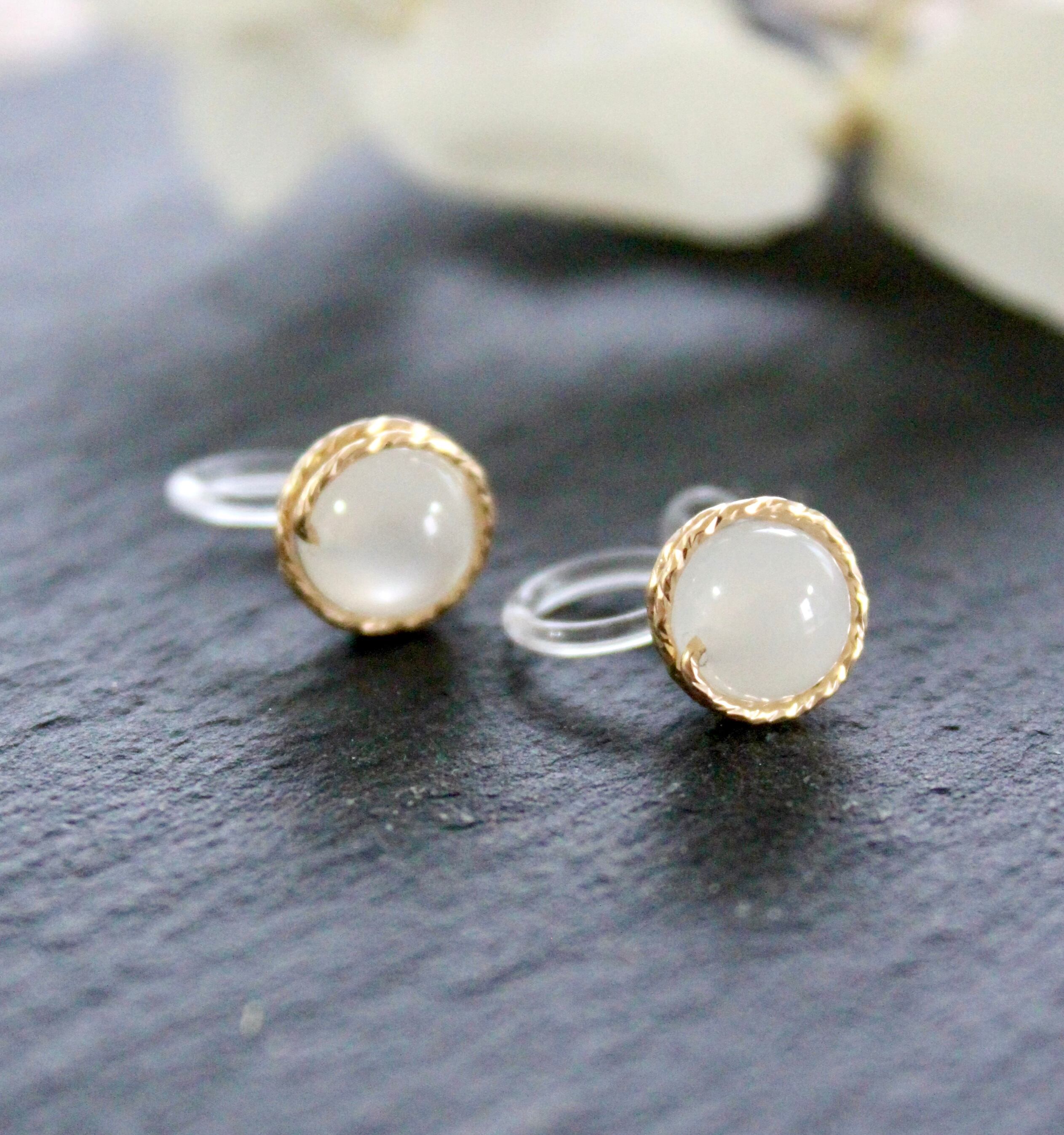 ・:*+. 一粒のぷっくりまるいムーンストーンを14kgfのスパークル ワイヤーでくるみ、シンプルなノンホールピアス タイプのイヤリング に仕立てました .:+